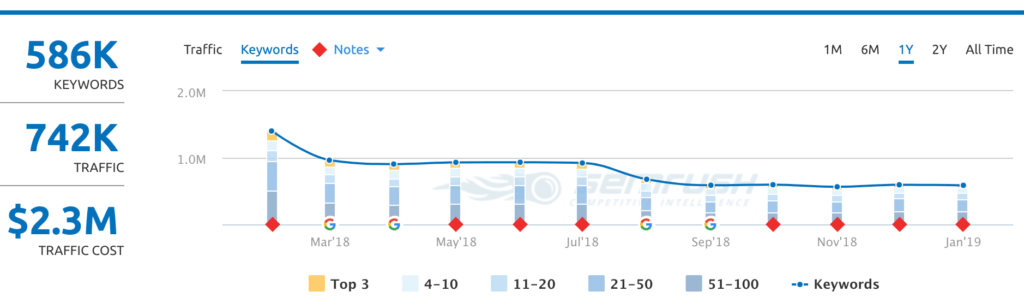 You can see from the below SEMrush one-year timeline that the drop occurred in early August, right in line with the Google algorithm change.