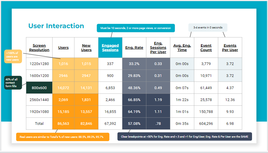 - Cross reference secondary dimensions – does the screen resolution combine with an old operating system?