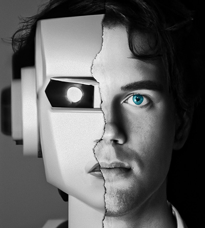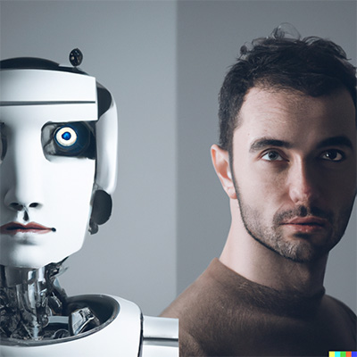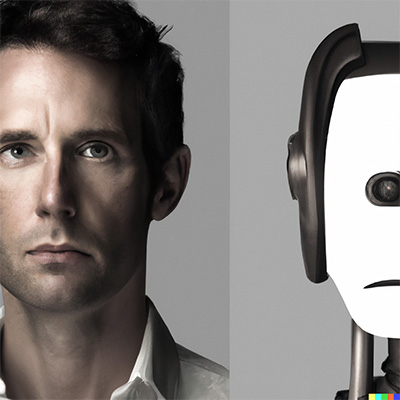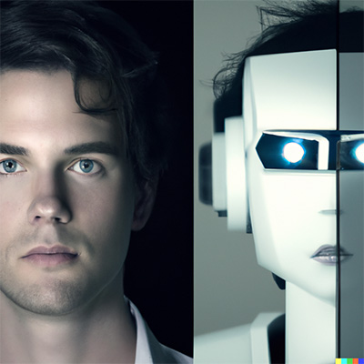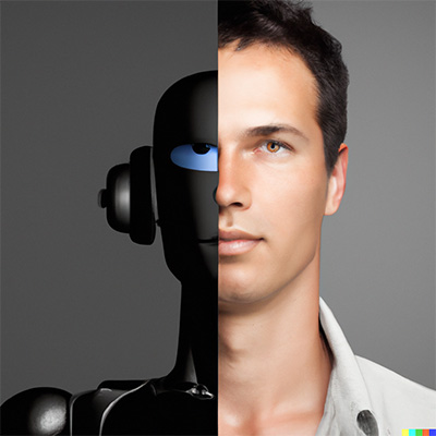 I began testing prompts within the AI generator, but there always seemed to be some kind of imperfections or shortcomings with the images, so I kept refining and finally got something from: “portrait of a man and robot split perfectly half screen”