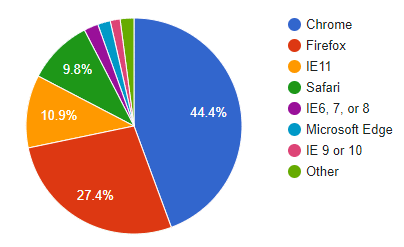 According to a September 2019 report by WebAIM, over 44% of screen reader users surveyed use Google Chrome as their preferred browser. On top of that, over 97% of users surveyed use either Chrome or one of the other major browsers: