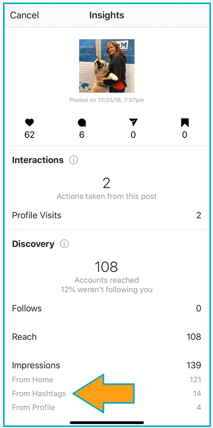 Since it’s difficult to tell how much individual hashtags impact your posts, you can see how many impressions your hashtags have generated for individual posts. These insights are only available through the Instagram mobile app, and you will need an Instagram business profile.